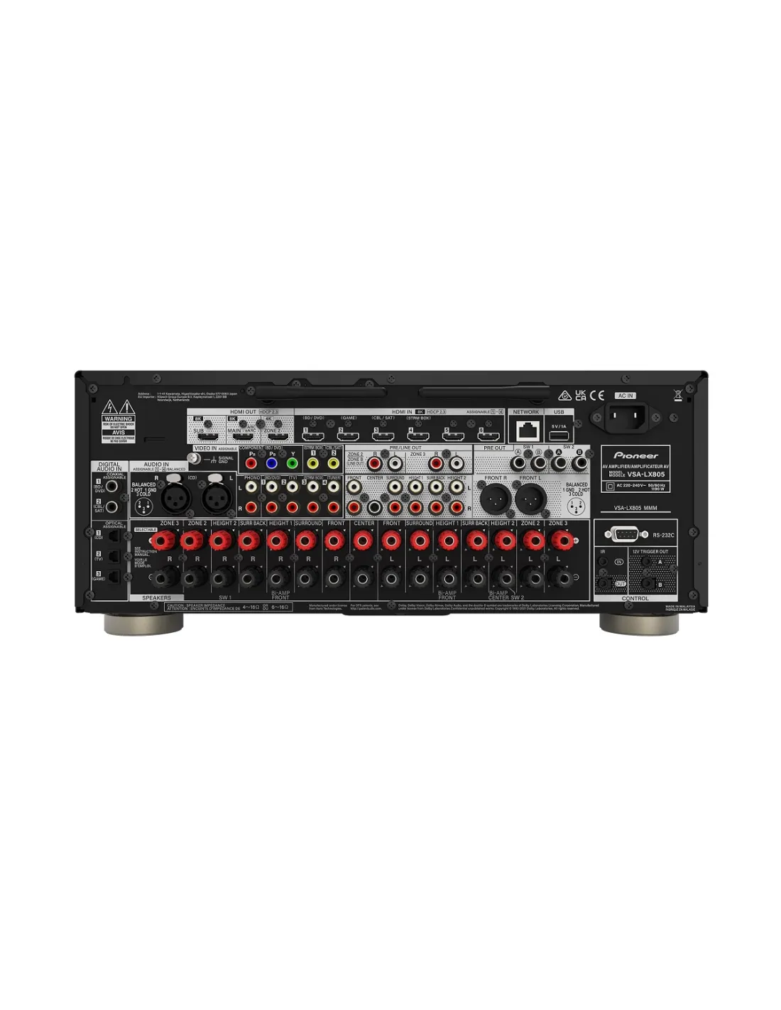 Pioneer VSX-LX805 został zaprojektowany do obsługi 11 kanałów wzmacnianych w konfiguracji 7.2.4 o wysokiej mocy 150W, wyposażony w technologię nowej generacji i obwody klasy studyjnej, z pewnością zaspokoi wszystkie potrzeby AV, gwarantując najwyższej jakości dźwięk i doskonałą wizję, aby spełnić marzenia o domowej rozrywce. Dla wszystkich kanałów zastosowano dwa przetworniki DAC ESS ES9026PRO 384kHz/32bit, które zięki niezwykle precyzyjnej konwersji cyfrowo-analogowej i wysokiemu stosunkowi sygnału do szumu, gwarantują potężny, bogaty i szczegółowy dźwięk. VSA-LX805 posiada wbudowany dostęp do kilku platform streamingowych i asystentów inteligentnego domu. Użyj Apple AirPlay, Google Home, Alexa, TIDAL, Pandora, Roon, Spotify, Amazon, Deezer, Chromecast lub Sonos.