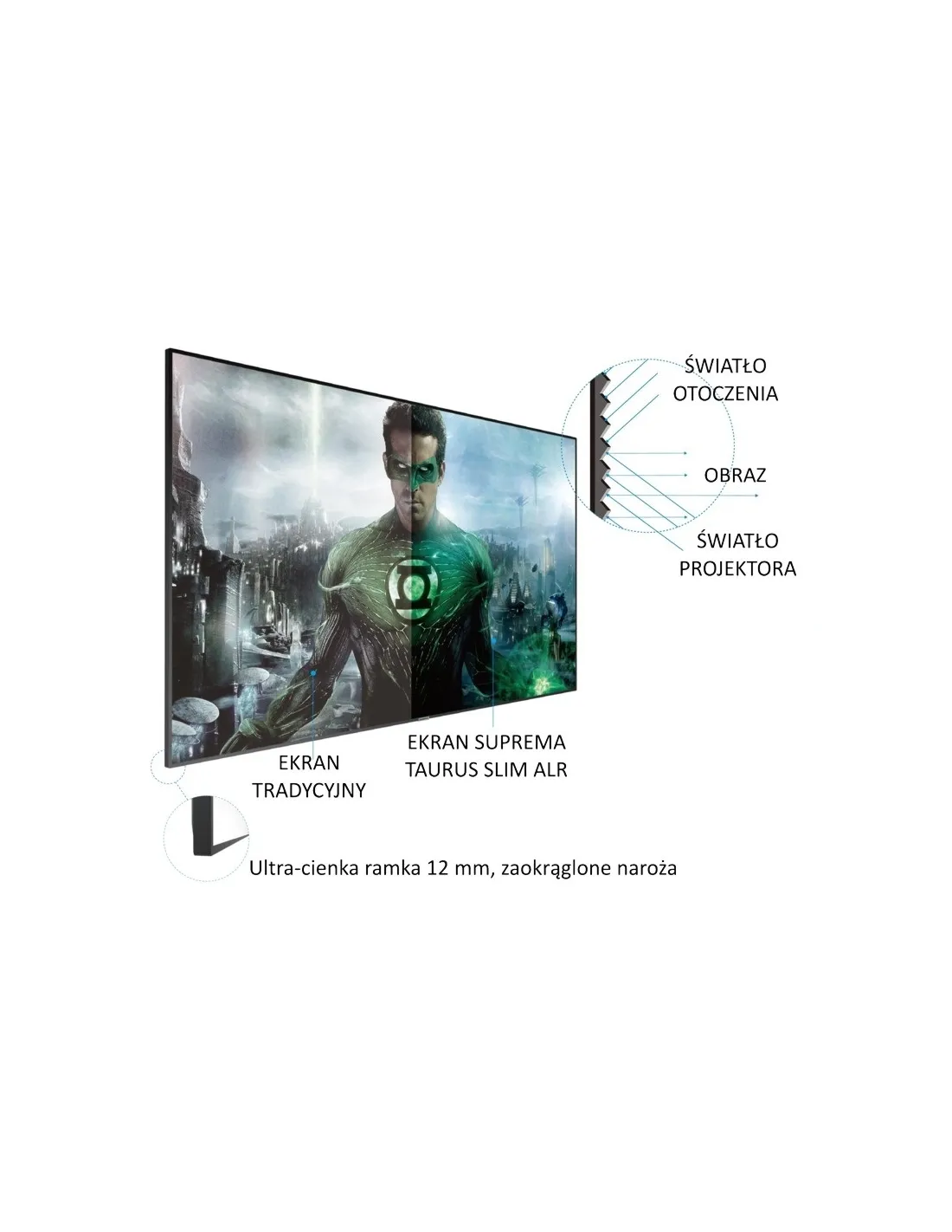 • Ekran stały, ramowy do powieszenia na ścianę, wyposażony w technologię ALR (Ambient Light Rejection), która w zestawieniu z ultrakrótkoogniskowymi projektorami, nawet w nasłonecznionym pomieszczeniu pozwala na cieszenie się z jasnego i kontrastowego obrazu.