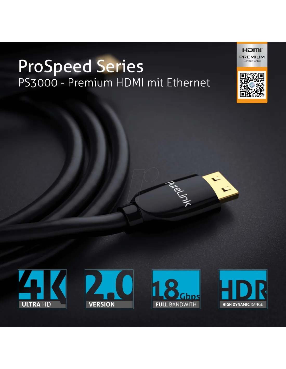 Seria Purelink ProSpeed PS3000 obsługuje pełną pasmo 18Gb / s przy długości do 5 metrów dla rozdzielczości do 4K @ 60Hz przy pełnym spektrum kolorów i kontrastu. Bezstratna transmisja zgodna ze standardem HDMI 2.0b jest możliwa dzięki trzykrotnemu ekranowaniu, złoconym stykom i zastosowaniu wysokiej jakości miedzi OFC jako wewnętrznych przewodników. Wtyk, środkowa skorupa oraz tylna część, w której kabel łączy się z całą wtyczką wykonane są z jednego kawałka metalu i są praktycznie niezniszczalne. Cechą charakterystyczną jest mały promień skrętu co razem z wysoką przepustowością i wysoką jakością sprawia, że kable doskonale sprawdzają się do instalacji profesjonalnych i domowych. Ekranowana, w pełni metalowa obudowa z 24-karatowym złotem złączami zapewnia najlepszą dostępną jakość transmisji sygnału. Wtyczka jest wyposażona w wypróbowany i zaufany system Secure Lock opracowany przez PureLink. Zapewnia stabilne połączenie nawet przy obciążeniu trakcyjnym, aż do siły ciągnięcia 6,8 kg. Jeśli zostanie przekroczony, kabel automatycznie odłącza się od gniazda, unikając kosztownych uszkodzeń urządzenia.