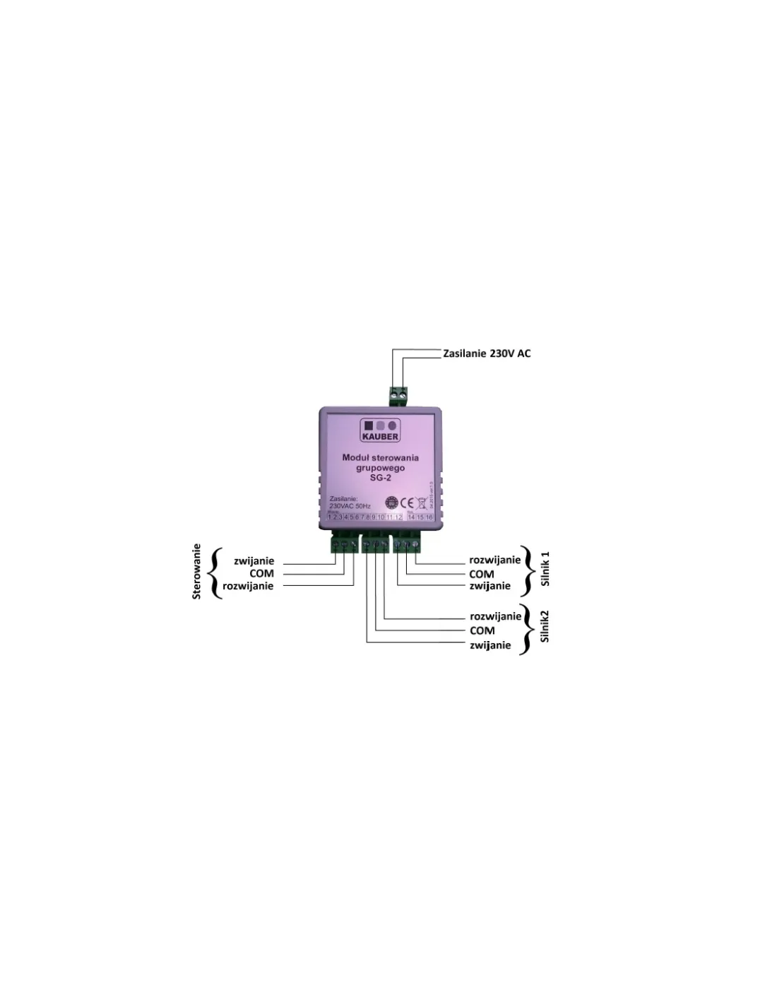 Urządzenie służy do jednoczesnego sterowania dwoma napędami 230V. Dzięki odseparowaniu wyjść silników mamy możliwość podłączenia dwóch urządzeń do jednego modułu sterującego. Moduł SG-2 wykorzystywany jest między innymi do jednoczesnego sterowania ekranu oraz windy z poziomu przełącznika bądź innego modułu sterującego typu: sterowanie radiowe RC-01, RC-02, Trigger, moduł IR lub RS. Sterowanie modułem odbywa się za pomocą napięcia 230VAC.