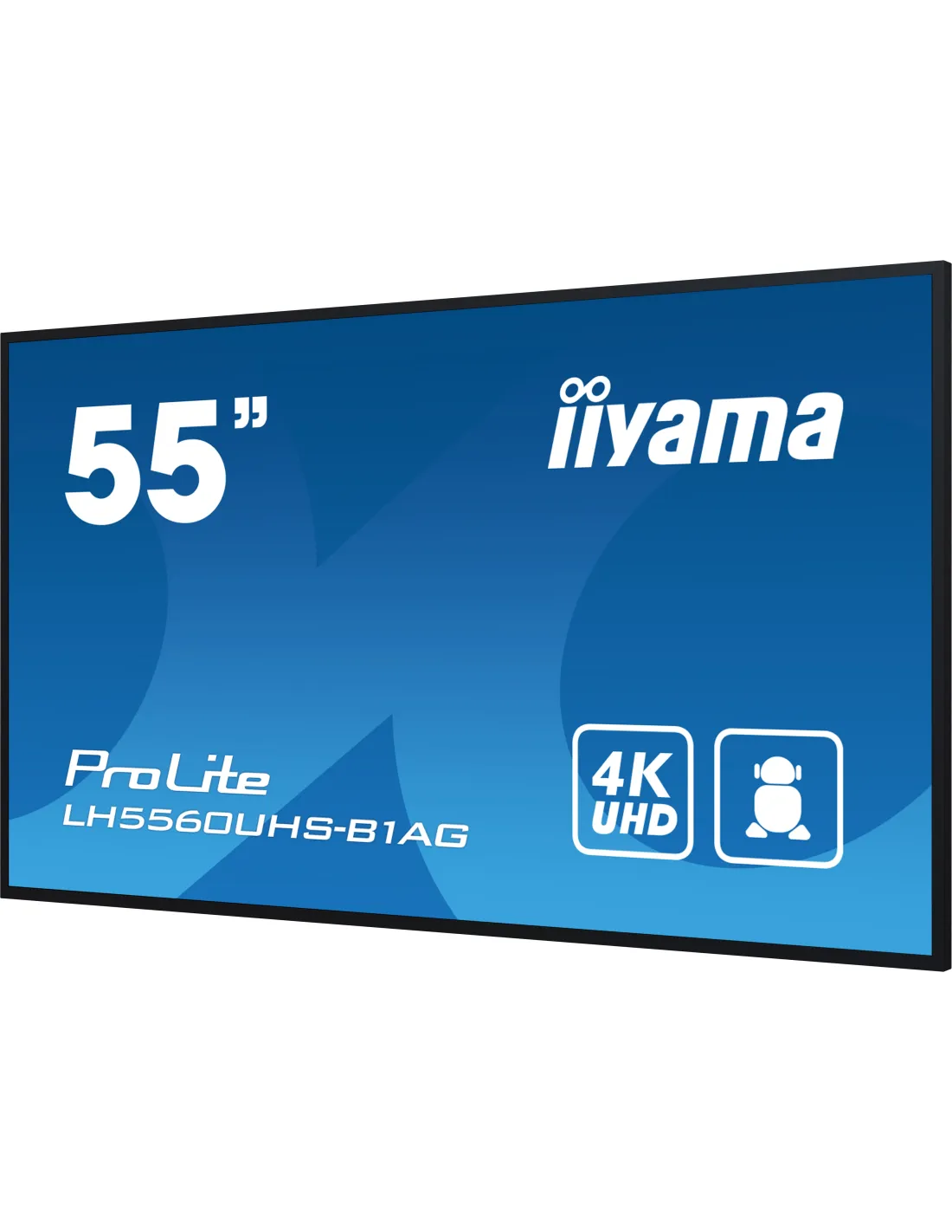 iiyama LH5560UHS-B1AG to profesjonalny 55-calowy monitor Digital Signage 4K UHD z matrycą VA, która odznacza się wysokim współczynnikiem kontrastu, a co za tym idzie, bardzo dobrym odwzorowaniem czerni. Rozdzielczość 3840x2160 charakteryzuje się czterokrotnie większą liczbą pikseli w porównaniu do powszechnie używanej rozdzielczości Full HD. To gwarancja niezwykłej ostrości i najwyższej jakości obrazu. Monitor z Android OS można łatwo dostosować do swoich potrzeb poprzez zainstalowanie odpowiednich aplikacji. Oprogramowanie do zarządzania treścią iiSignage wraz z funkcję Signal FailOver sprawia, zarządzania i udostępnianie treści jest bardzo proste. Wiele wejść wideo i audio gwarantuje kompatybilność z licznymi urządzeniami.