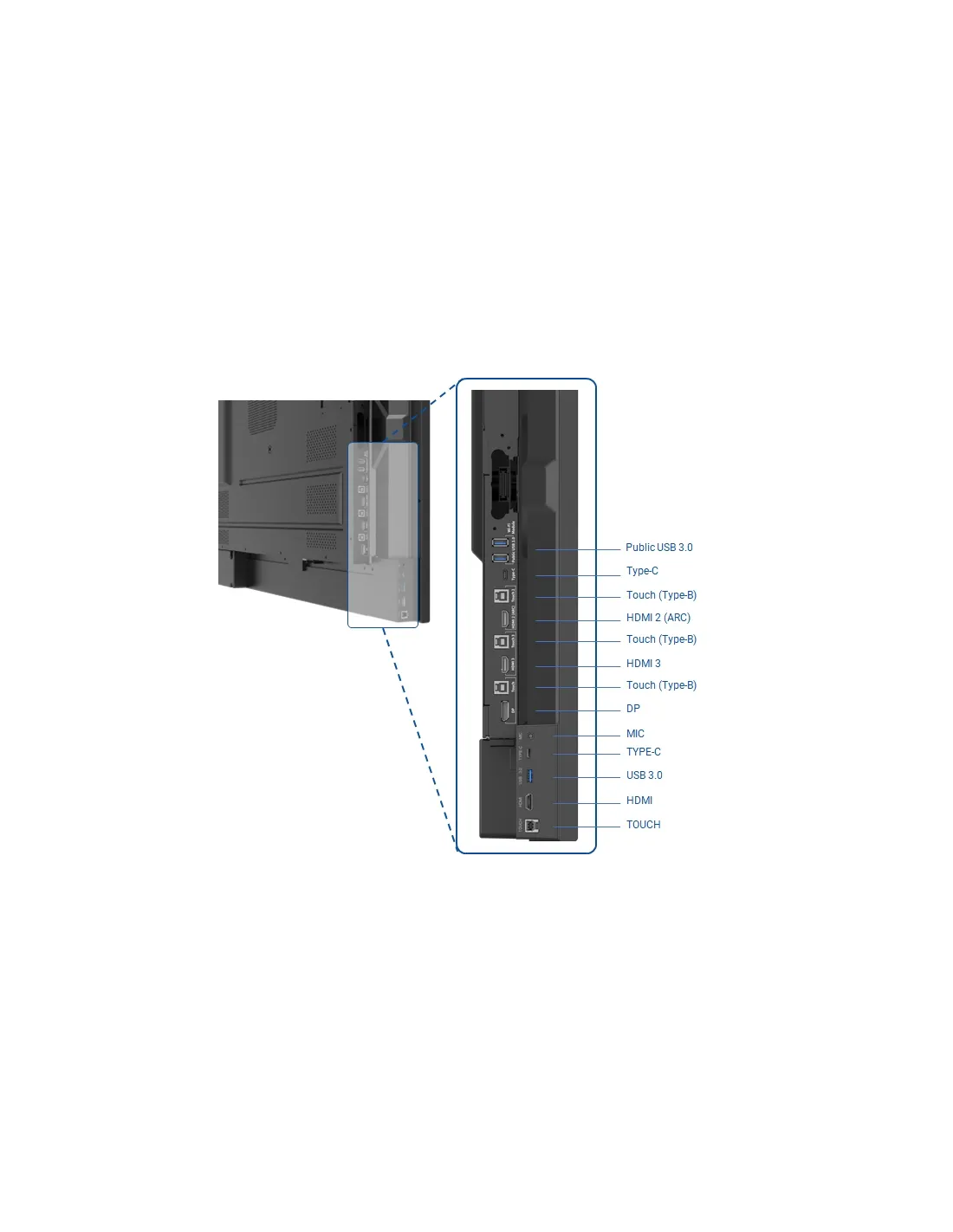 - HDMI 2.0 x3, DisplayPort x1, USB-A x4, USB-B x3, USB-C x2, RJ45 x1, Slot OPS, RS232 x1, jack 3,5mm