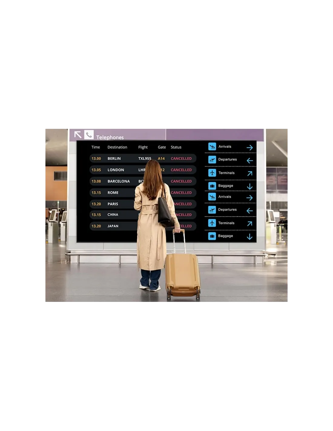 - Złącza: HDMI, DVI, VGA, RS232, DisplayPort – łatwa integracja z różnorodnymi systemami i urządzeniami
