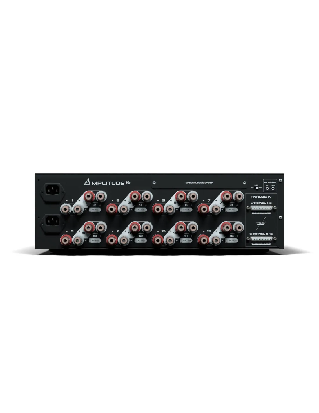 W podstawowym modelu znajduje się 16-kanałowy wzmacniacz mocy o mocy 200 W/kanał przy 8 omach i 400 W/kanał przy 4 omach. Wychodząc poza to, Amplitude16 zapewnia integratorowi opcję mostkowania par kanałów wzmacniacza w celu zwiększenia dostępnej mocy dla określonych wyjść. Umożliwia to firmie instalacyjnej maksymalizację mocy dla kanałów o największym zapotrzebowaniu (kanały lewego, środkowego i prawego ekranu). W trybie zmostkowanym moc wzrasta do 800 W/kanał przy 8 omach i ponad 1000 W/kanał przy 4 omach.