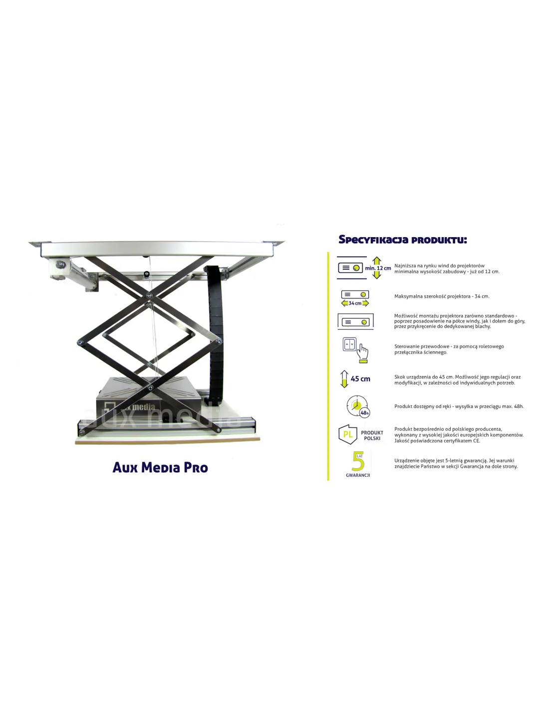 Polska firma Aux Media powstała w odpowiedzi na rosnące zapotrzebowanie na produkty z branży audiowizualnej, które nie są produkowane w Azji. Producent za główny cel postawił sobie przede wszystkim wysoką jakość oferowanych wind do projektorów, jednocześnie dbając o to, aby wszystkie z nich były w 100% produkowane w Europie. Popularność, jaką cieszą się obecnie rozwiązania proponowane przez polską firmę, doskonale dowodzi, że udało się jej go osiągnąć. Aux Media proponuje windy do projektorów wyróżniające się trwałością na lata, wysoką jakością i łatwą dostępnością. Dodatkowo wszystkie modele dostępne w ofercie firmy uzyskały certyfikat CE, który gwarantuje bezpieczeństwo użytkowania. Różnorodność asortymentu oraz dopasowanie rozwiązań i do rzutników przeznaczonych do tradycyjnej instalacji, i do montażu dołem do góry sprawiają, że każdy klient znajdzie w ofercie Aux Media coś dla siebie.
