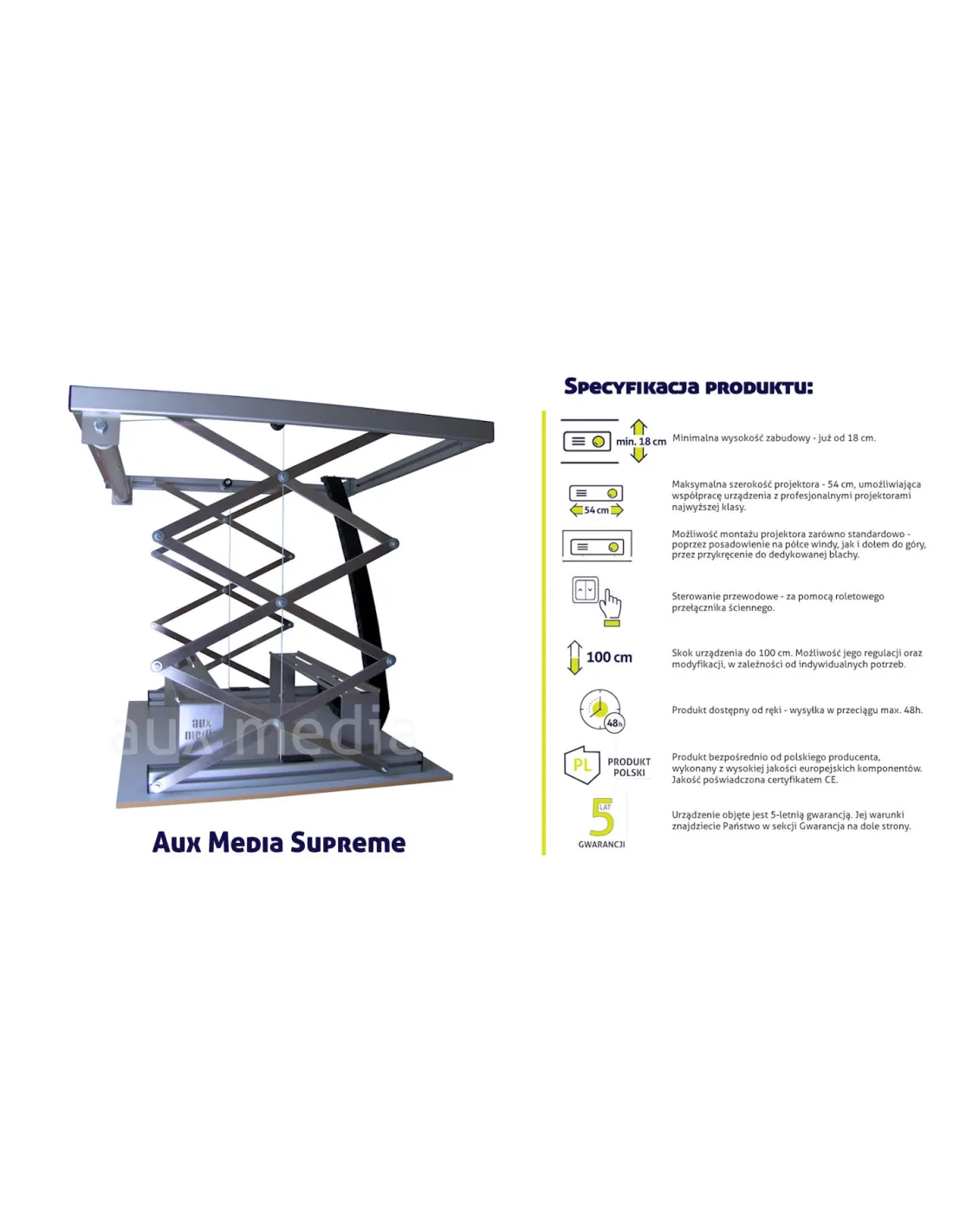 Aux Media to Polska firma specjalizująca się w produkcji wysokiej jakości wind do projektorów. W ofercie znajdują się windy do projektorów o różnych wymiarach, w tym do kinowych dużych modeli. Model Supreme Line jest w stanie utrzymać projektor o wadze do 25 kg i szerokości aż 54 cm z minimalną wysokością zabudowy 18 cm. Ciekawostką jest to, iż można zamontować projektor dołem do góry.